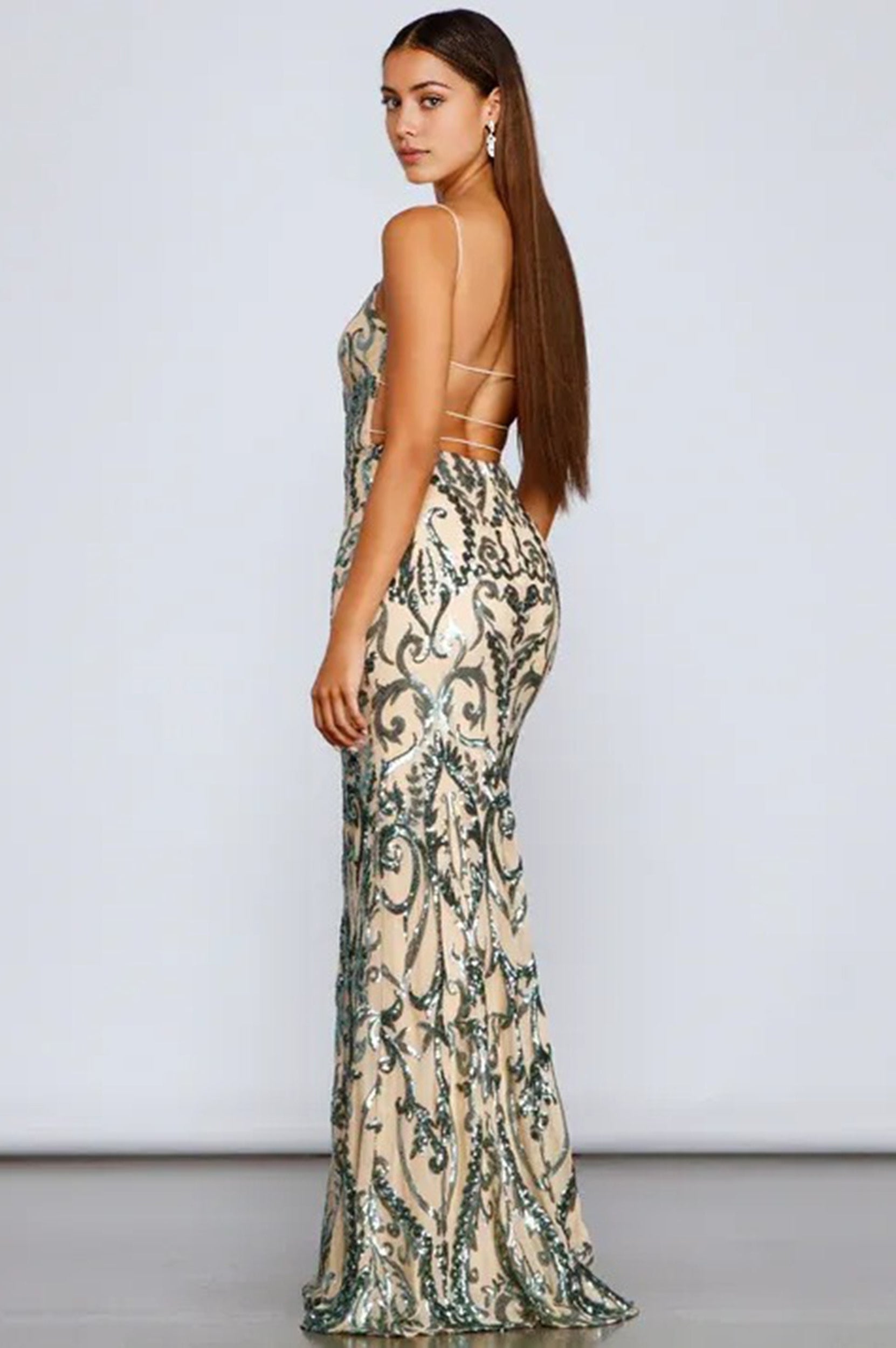 Bring the sparkle with a formal dress that dazzles from all your best angles!  features a sleeveless scoop neckline with padded cups, bungee spaghetti straps, a bold backless design accented with bungee bar straps, a sequin scroll print pattern, and a mermaid silhouette. The dress is composed of a lined mesh fabric that offers a form hugging fit with minimal stretch. Complete look with rhinestone heels and a clutch.